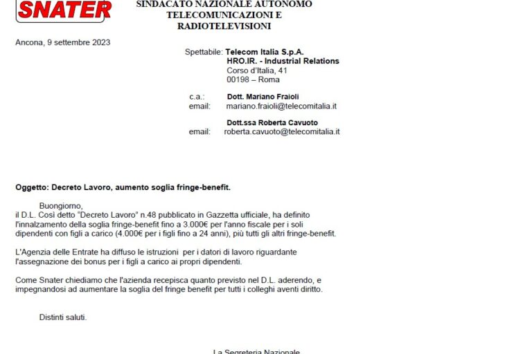 SNATER: lettera ad azienda per richiesta aumento fringe-benefit ai dipendenti come previsto dal Decreto Legislativo 48 scarica il documento: 2023.09.09…